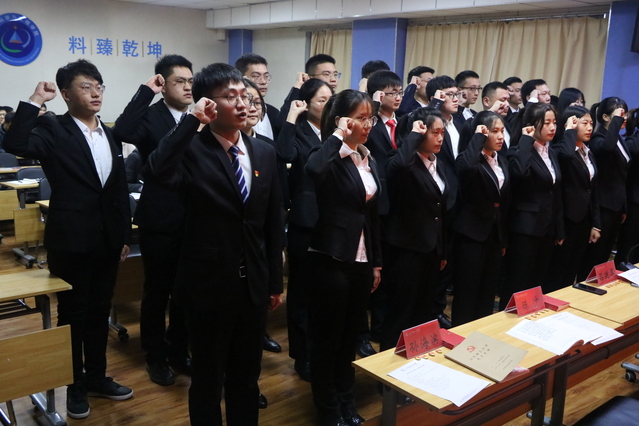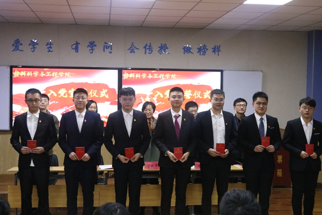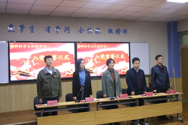 会议开始,全体人员起立,奏《国际歌》。随后,22名新发展党员面对鲜红的党旗庄严宣誓,并由在场老师为其佩戴党徽、赠送《党章》。