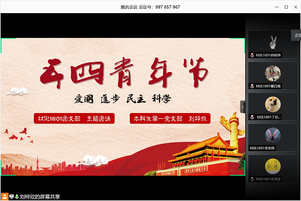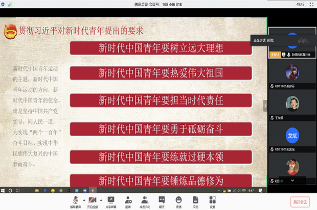 党员同志们在五四青年节期间以“纪念五四运动101周年”、“学习五四精神”、“学习习总书记在五四运动100周年上的讲话”为主题,讲授团课,以自身理解向广大同学阐述了“爱国、民主、进步、科学”的伟大五四精神。切实提高了同学们对五四运动的理解,进一步加深了同学们对新中国的热爱和崇敬之情。部分同志在讲授团课的同时结合当今疫情发展,与所结对支部成员共同回顾在此次疫情中涌现出的无数英雄人物,尤其是大批青年志愿者的英勇事迹。通过学习青年志愿者无私奉献的高尚品格,使得支部成员均意识到了自己作为青少年应当承担起的重任并为之努力奋斗!