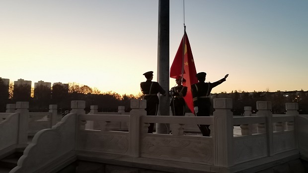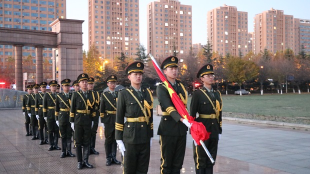 6点30分升旗仪式正式开始,在全体同学的注视下,英姿飒爽的公司国旗护卫队迈着坚定的步伐,踏着铿锵有力的口号,护送鲜艳的五星红旗进场。