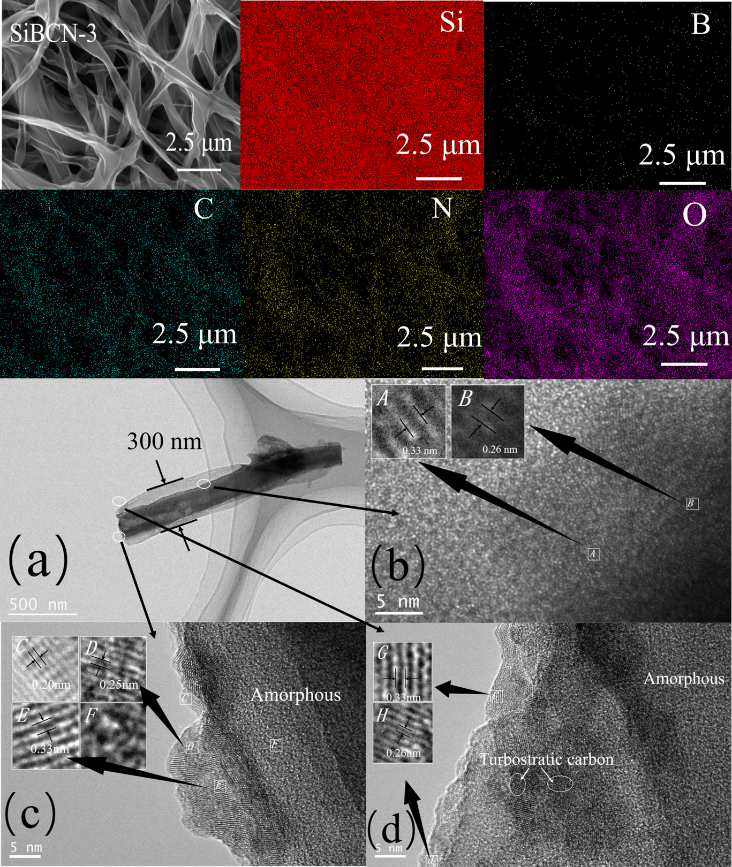 图2 SiBCN-1300样品的SEM以及对应区域的EDS图像, (a)-(d) TEM图像