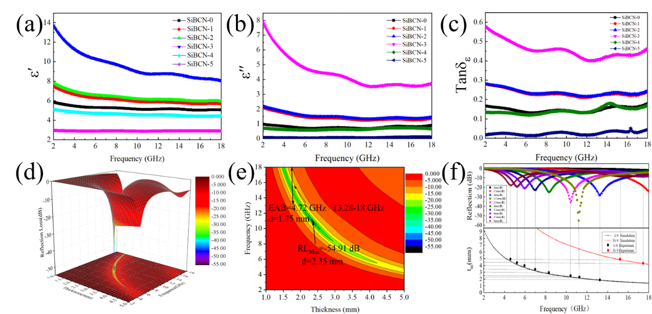 图3 SiBCN-1300样品的部分性能图 (a) 介电实部, (b) 介电虚部, (c)介质损耗因子, (d) 反射损耗, (e) 带有具体性能参数的反射损耗, (f) 干涉损耗