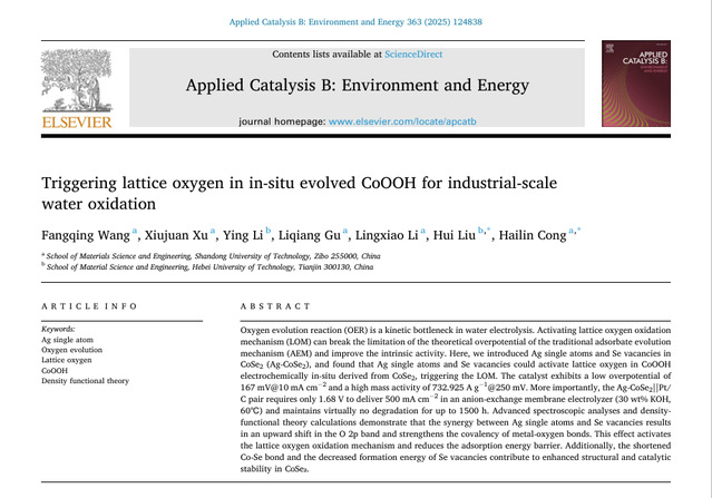 近日,丛海林教授团队青年教师王芳卿在电催化水分解制氢领域取得重要进展,相关论文以“Triggering lattice oxygen in in-situ evolved CoOOH for industrial-scale water oxidation”为题,发表在国际知名期刊《Applied Catalysis B: Environment and Energy》(2023年影响因子20.2,中科院一区Top)上。王芳卿副教授为第一作者,公司丛海林教授和河北工业大学刘辉教授为共同通讯作者,betway西汉姆联官方官网为本文第一通讯单位。