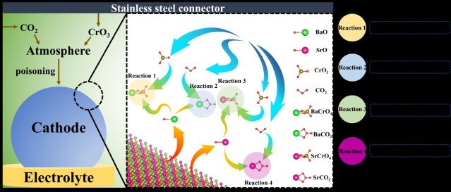 该论文基于第一性原理,以Ba0.5Sr0.5Co0.8Fe0.2O3-δ(BSCF)为基体,通过高通量计算对13种潜在掺杂元素进行组合与筛选,设计了一种新型的固体氧化物燃料电池高熵阴极材料Ba0.4Nd0.1Sr0.5Co0.6Ni0.1Zr0.1Fe0.2O3-δ(BNSCNZF)。该高熵阴极具有优异的电子导电性、氧还原活性和Cr、CO2耐受性,成功解决了制约传统阴极材料的氧还原动力学缓慢和Cr、CO2耐受性差的问题,在氧离子型和质子型SOFC中均表现出优异的电池输出性能和长期稳定性。