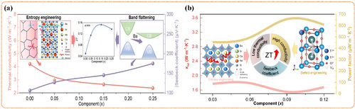 基于此,作者采用基于成分设计的熵工程设计并制备了一系列Ca0.25Nd0.25Sr0.5-xBaxTiO3 (x = 0, 0.05, 0.15, 0.25)陶瓷,通过调整Ba含量精确调控了构型熵,在引入点缺陷、局部应变场、位错和晶界在内的多尺度缺陷有效散射声子的同时,调整了能带结构并优化了Seebeck系数,平衡了载流子和声子散射之间的关系,实现了电热输运性能的协同优化(图a,Inorg. Chem. 2024, 63, 24724)。此外,由于化学无序、晶粒细化以及缺陷浓度增加,陶瓷的硬度提高。进一步结合缺陷化学原理,在(Ca0.25Nd0.25Sr0.35Ba0.15)1-xTiO3 (x = 0.03, 0.06, 0.09, 0.12)中构建了一系列不同程度的A位缺失,发现这不仅促进氧空位和Ti³⁺的形成显著提高了载流子浓度,还通过改善结构对称性以及减少晶界散射提高了载流子迁移率,在保持低热导率的前提下,使功率因数得以进一步提升(图b,Rare Met. 2025)。这些工作强调了熵工程和缺陷化学相结合的策略在调控SrTiO3基热电氧化物电热输运方面的重要意义。