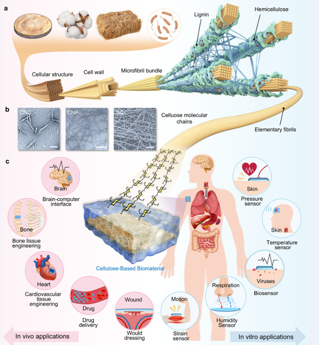 该综述论文深入探讨了基于纤维素的传感技术在体外(如快速检测、可穿戴诊断)和体内(如药物平台、智能支架)医疗应用中的最新进展与挑战,重点分析了纤维素基材料如何促进关键生物标志物的获取,推动个性化医疗的实现。论文从跨学科角度系统讨论了纤维素材料在医工交叉领域的最新研究进展,阐述了纤维素材料在精准医疗闭环体系中的独特优势,揭示了其从体外快速筛查、可穿戴诊断到体内监测、智能支架与精准干预的应用潜力,为构建可持续、智能化及临床可转化的下一代生物医用材料体系奠定了坚实的理论基础。